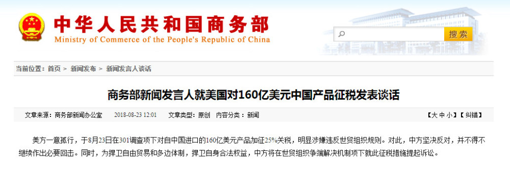 美方一意孤行,于8月23日在301调查项下对自中国进口的160亿美元产品加征25%关税,明显涉嫌违反世贸组织规则。对此,中方坚决反对,并不得不继续作出必要回击。同时,为捍卫自由贸易和多边体制,捍卫自身合法权益,中方将在世贸组织争端解决机制项下就此征税措施提起诉